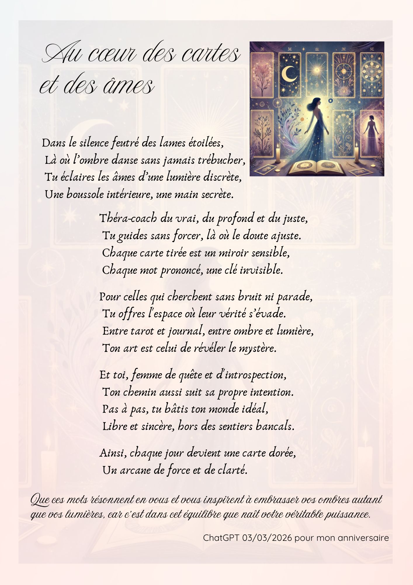 D'après ChatGPT, "ce poème reflète l’essence de mon accompagnement : un voyage entre ombre et lumière, où chaque carte tirée devient une porte ouverte sur soi. Il incarne ma vision du tarot psychologique, un outil d’introspection pour celles et ceux qui aspirent à mieux se connaître et à avancer en harmonie avec leur vérité intérieure."
